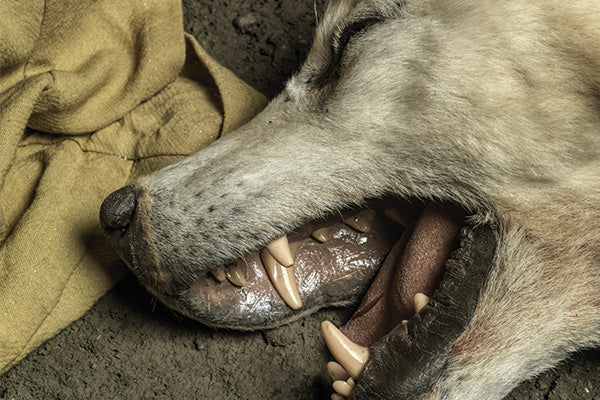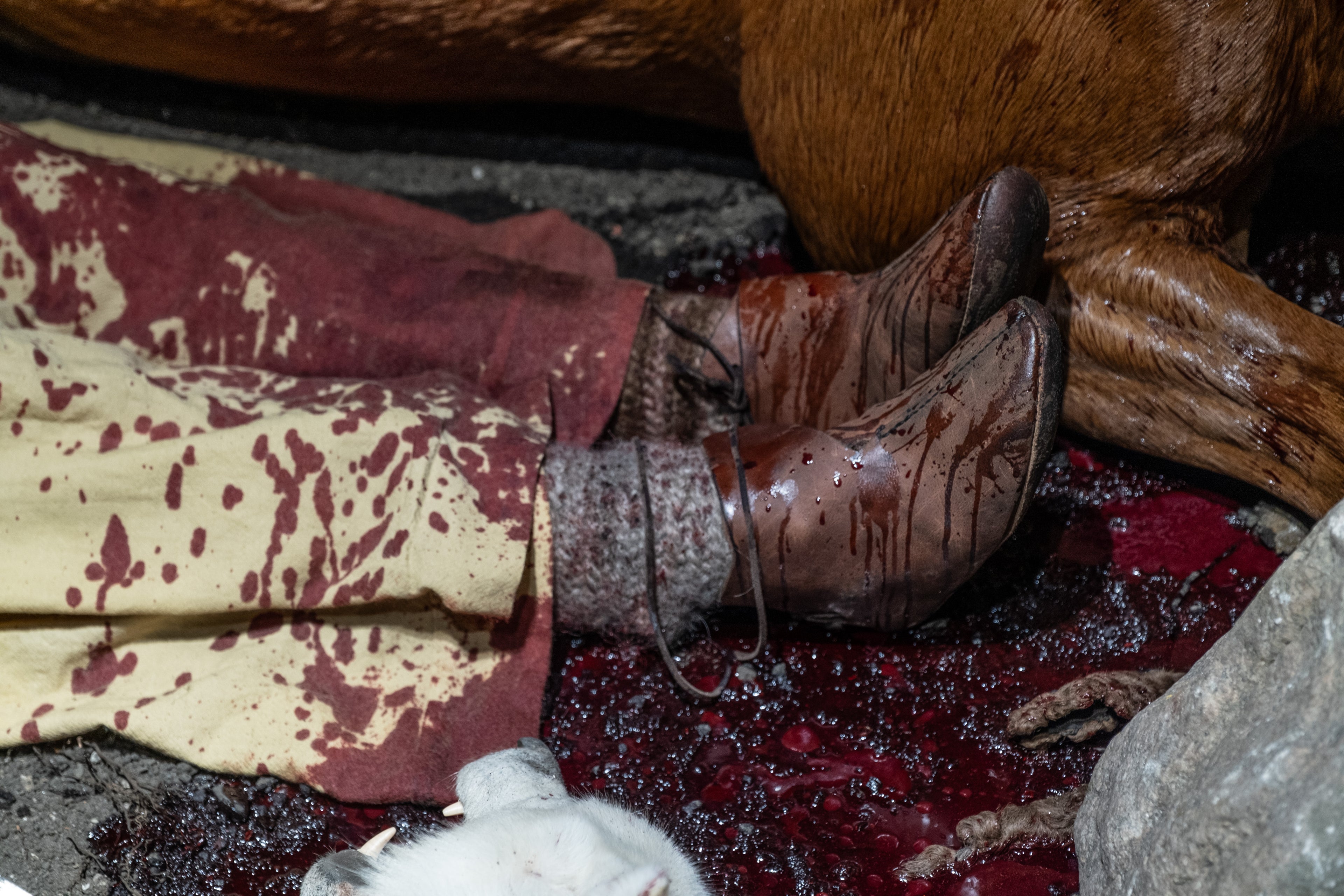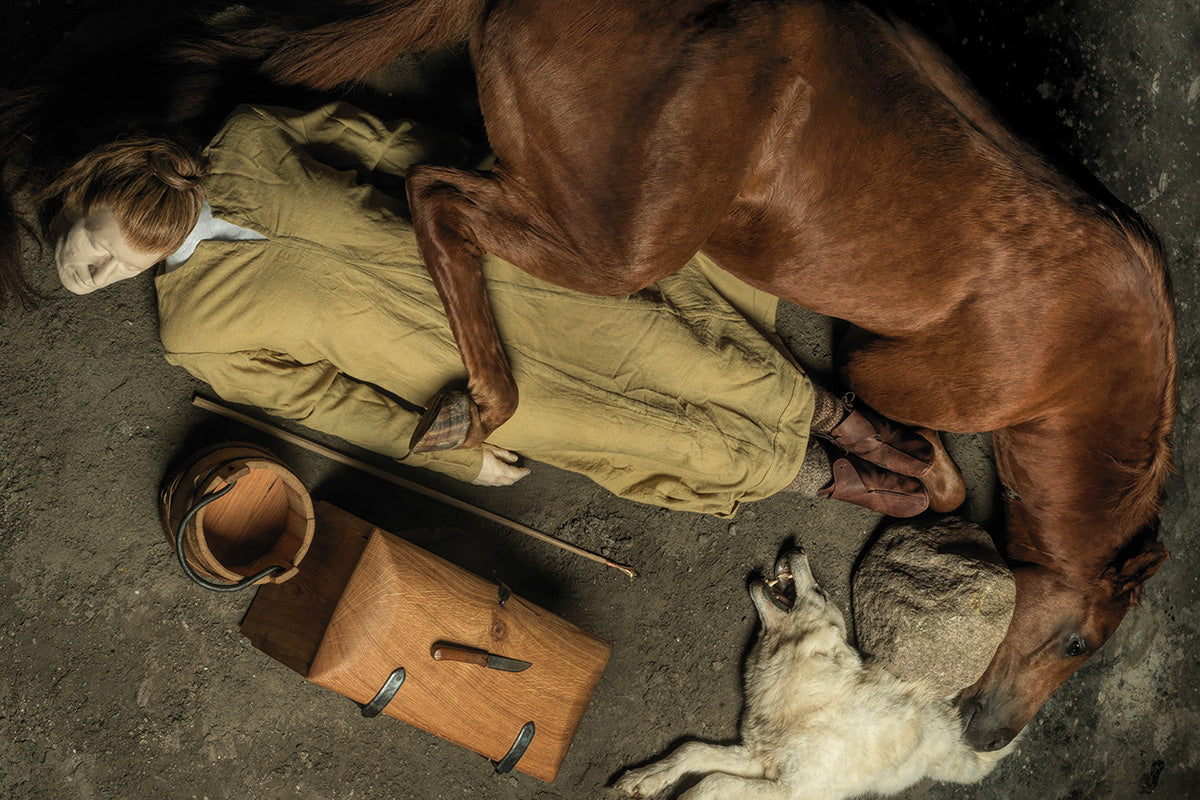 The wolf is not alone. Among other things, a sheep fetus and a dog are placed in her grave. The dog is split in two, twisted half a turn and placed around a stone pillar at the wolf's feet. The old stallion is dragged to the grave. They provoke it with blows and shouts, until it glistens with sweat and foams at the mouth. Then they stab and slash the animal until the blood spurts in all directions. When the stallion dies, it is dragged into the grave. It is placed on its stomach with one leg over the wolf's body.