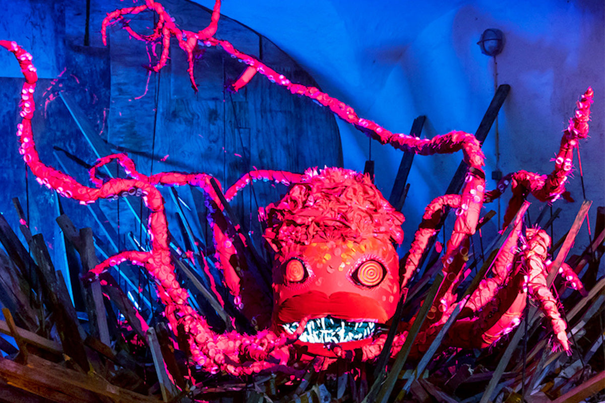 Stå fx ansigt til ansigt med Den Triste Bleemya med skelet og krop af en gammel haveparasol og aflagte tekstiler, næse af skumgummimadras og øjne af frisbees. Se monstret i øjnene og mærk, hvordan kreativitet kan være medvirkende til at bearbejde følelser og tanker på en konstruktiv måde.
