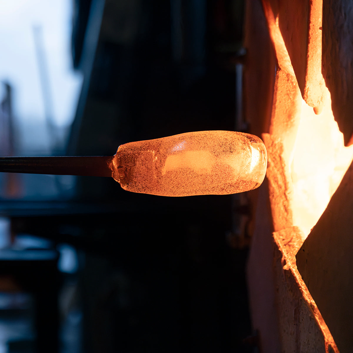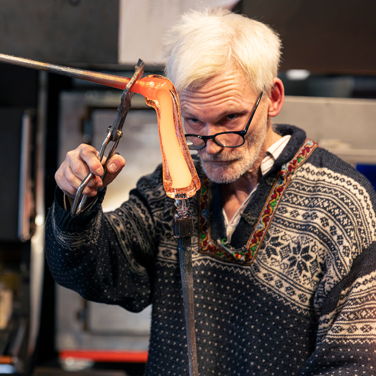 De varme glasemner svinges, trækkes og formes i præcise bevægelser, hvor tyngde og skrøbelighed konstant udfordrer idéen. Det handler om det rigtige sving. Den rette kurve. Den balance, hvor det tunge glas løfter sig og bliver let.